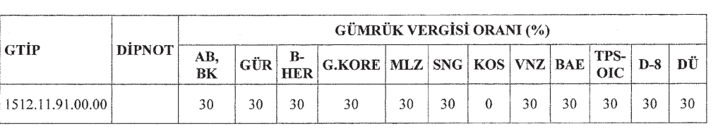 MADDE 2- Aynı Karara ekli (I) sayılı listede yer alan “15. FASIL” başlıklı tabloda bulunan ve aşağıda gümrük tarife istatistik pozisyonu (GTİP) belirtilen eşyaya ilişkin satır aşağıdaki şekilde değiştirilmiştir.